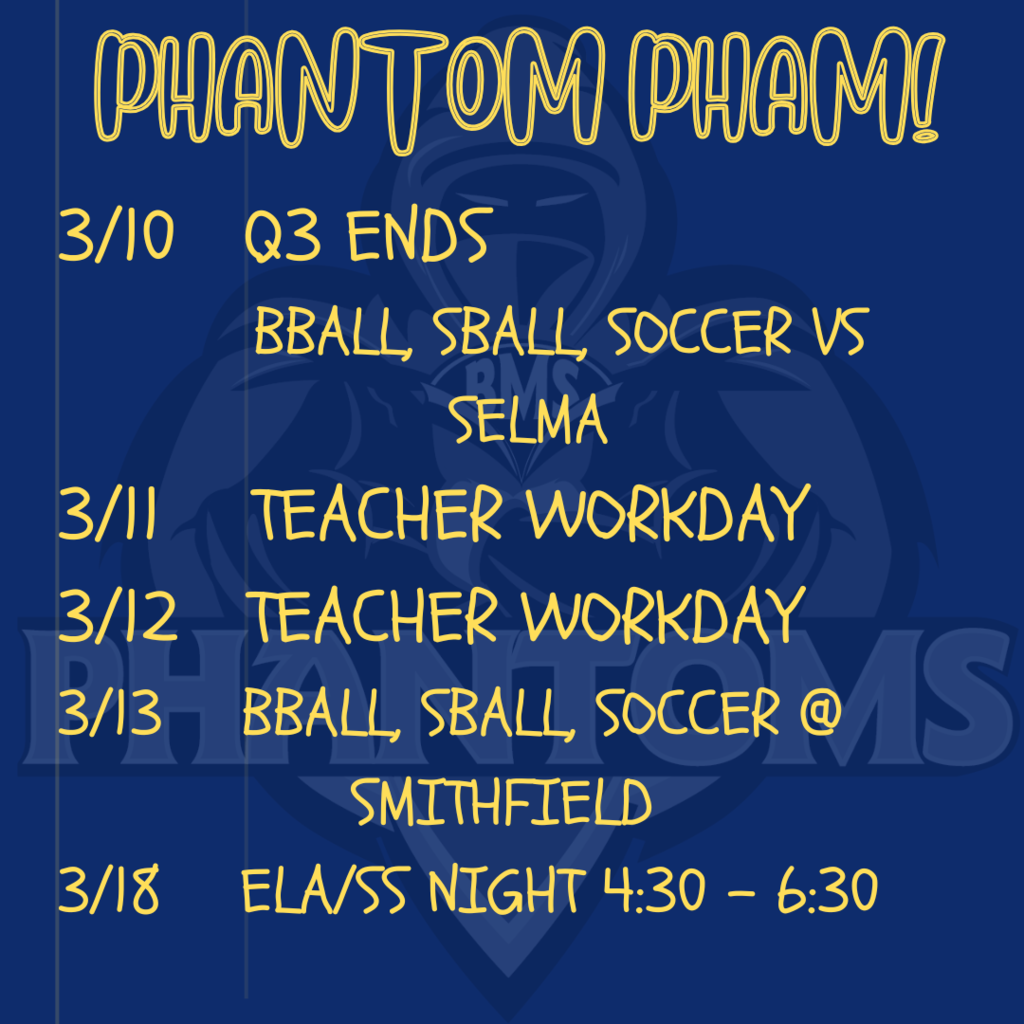 Today we focus on the Phantoms who have displayed great strides in their Academics: Savadra Bates, Bella Ramos, Palmer Beckham, Keith McDougald, Ian Bonilla, Levi Moye